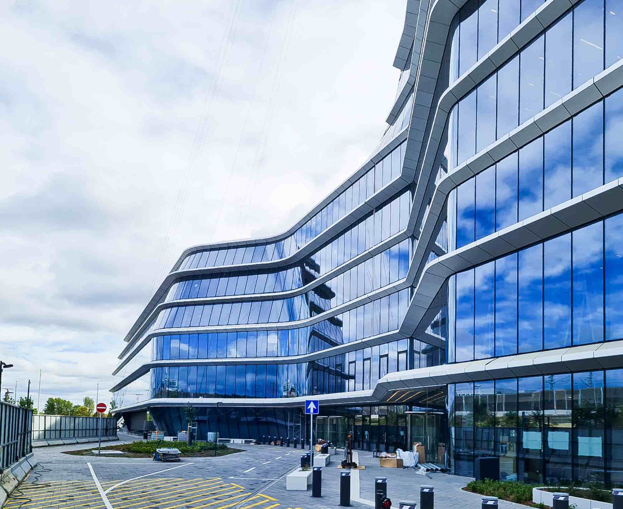 Another example is its use at the MOL campus in Budapest. Here, both straight and around 500 differently convex and concave curved glass elements had to be installed. With the Heavydrive GMG installation robot and various vacuum suction systems for straight and curved panes, installation was even possible under protrusions without any problems.