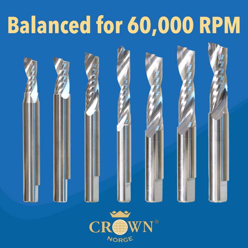 Crown Norge implements strict quality control measures during the manufacturing process of the tools to ensure that each cutting tool is the same as the last one used. This gives the operator peace of mind, knowing that nothing needs to be adjusted when changing over a worn tool. The sound of the tool while cutting is generally a good indication of how well the tool is performing. Crown Norge started balancing engraving tools in 1996 and then was the first to introduce a balanced range of single fluted spiral tools in 2003, allowing for spindle speeds of up to 60,000 RPM. These tools are incredibly quiet while cutting materials and produce an exceptional cut finish. Specific tools from Crown Norge are available for specific materials which are designed to increase the number of meters cut and give the best finish possible. For materials such as aluminium, the SUPERIOR and DLC coatings extend the tool life and allow for faster feed rates while cutting the aluminium dry.