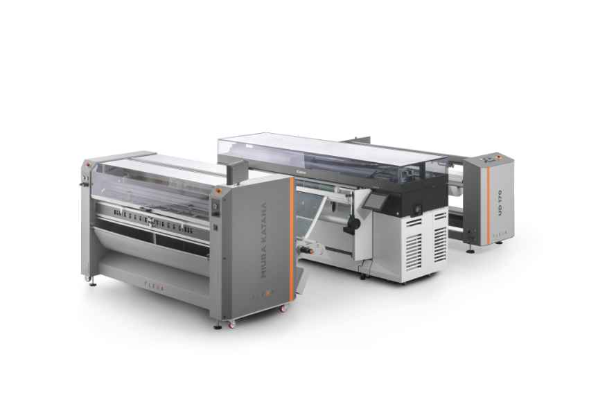 The first is an in-line system for automatic wallpaper cutting, composed of the Miura Katana working seamlessly with large-format digital printers such as the Canon Colorado. This setup can process jumbo rolls through the UD 170 unwinder, which feeds the printer continuously with maximum accuracy.