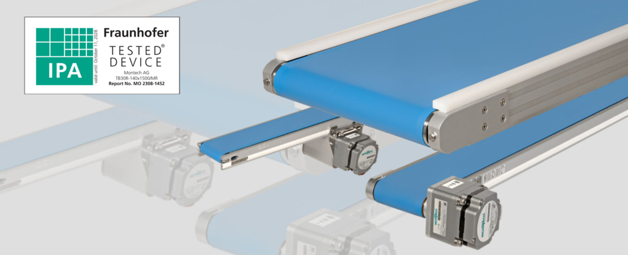 Montech AG is a Swiss technology company that has been providing groundbreaking solutions in conveyor and profile technology for more than 60 years. These include modular transport solutions specifically designed for sensitive production environments. The TB30R-140×1500/VR, TB40R-400×1500/VR, and TB30R-140×1500/MR belt conveyors from Montech’s product range have been extensively tested and certified by the Fraunhofer IPA. These three models are proven to meet cleanliness requirements up to ISO 4.