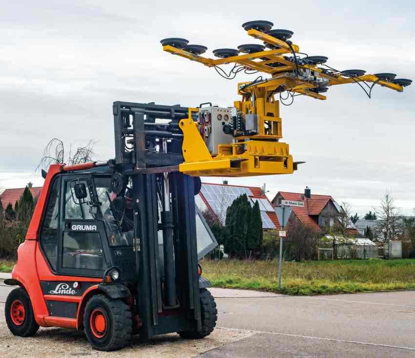 Also, our innovative lifting technology minimises the risk of errors during tricky installation processes. There is no need for heavy loads to be installed manually by a large team. Instead, the components can be positioned safely and precisely with minimal manpower and reduced physical strain on the installers – for example, by using a vacuum lifting system mounted on an assembly crane or telescopic handler.