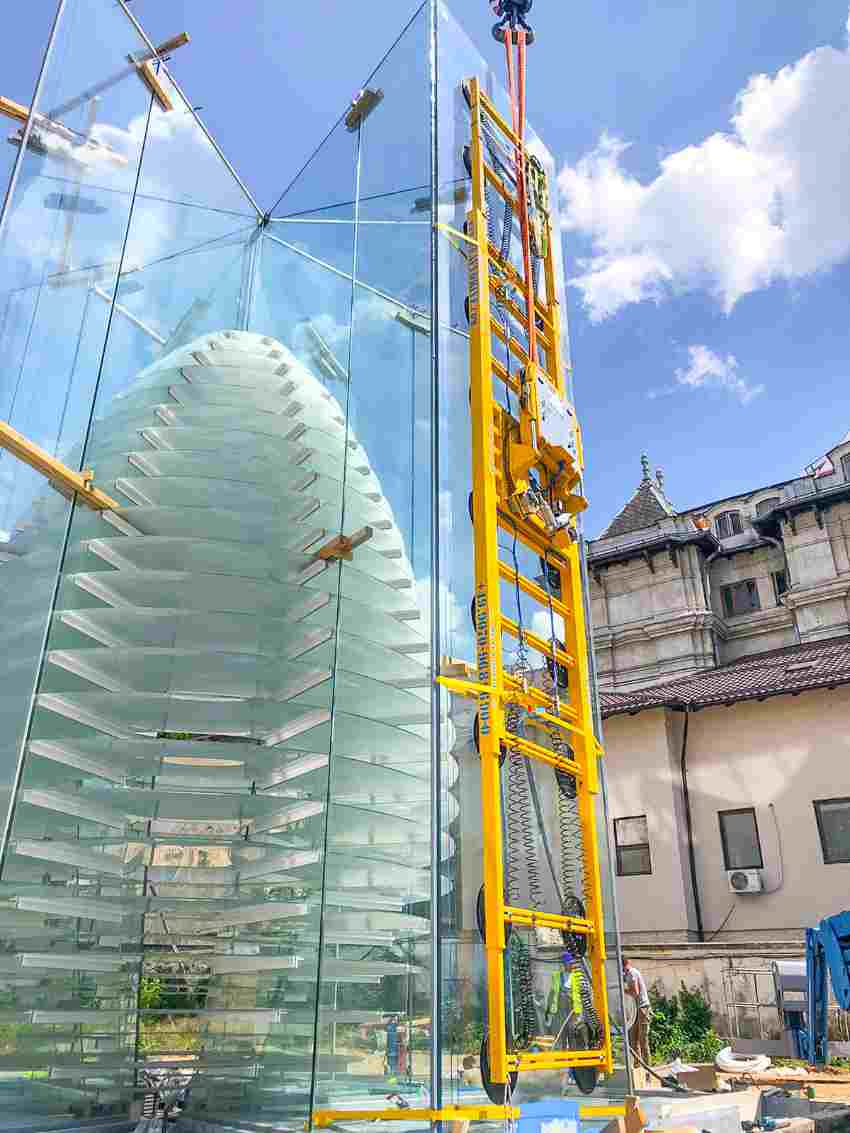G.Ü: One example of Heavydrive’s perfect all-round service was the glass installation at the Brâncuși Pavilion in the Craiova Art Museum. For the glass pavilion designed by renowned architect Dorin Ștefan, six panes from Finnglass measuring 2.4 by 12.5 metres and weighing 2.8 tonnes had to be set vertically into grooves. Plus, the elements had undulating contours and were narrower at the bottom than at the top.