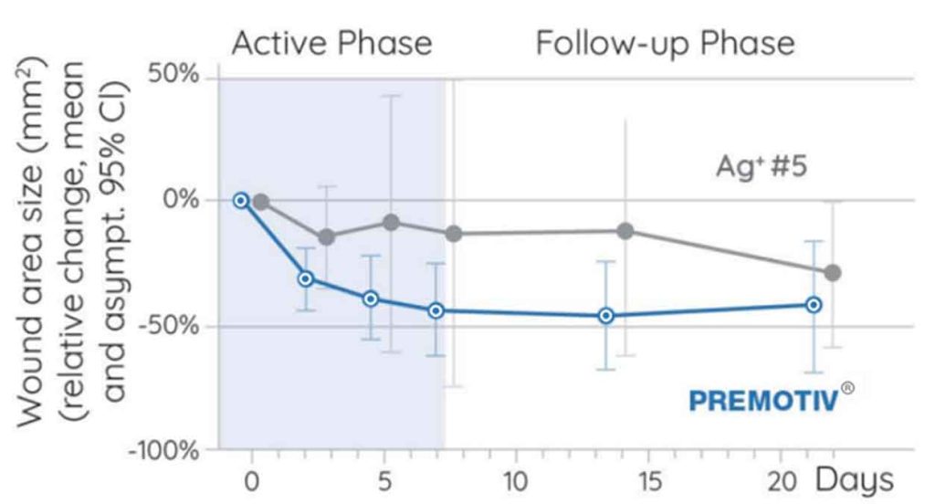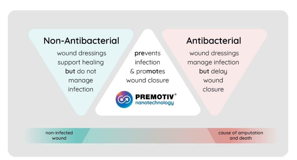 A.L.K: With our technology we would like to change how we see wound care today. The company started with research about the environmental aspects of silver nanoparticles and found that silver is the most used element in wound care. Although very efficient antibacterial, it is also a slightly toxic element to the cells and to the environment. In Premotiv® technology, we have decreased toxicity and increased efficacy by significantly reducing silver concentration and using it smartly/synergistically to enhance copper antibacterial properties reaching the point where we have the most innovative silver technology in the world. In this way, we designed a smart combination of nanoparticles by combining silk nanofibers with silver and copper and achieved high efficacy with high safety. We call this technology Premotiv® because it is designed to prevent infection and promote wound healing (Figure 3). Our first product is tested on diabetic foot ulcer patients, but we are already widening the product portfolio to other wounds.