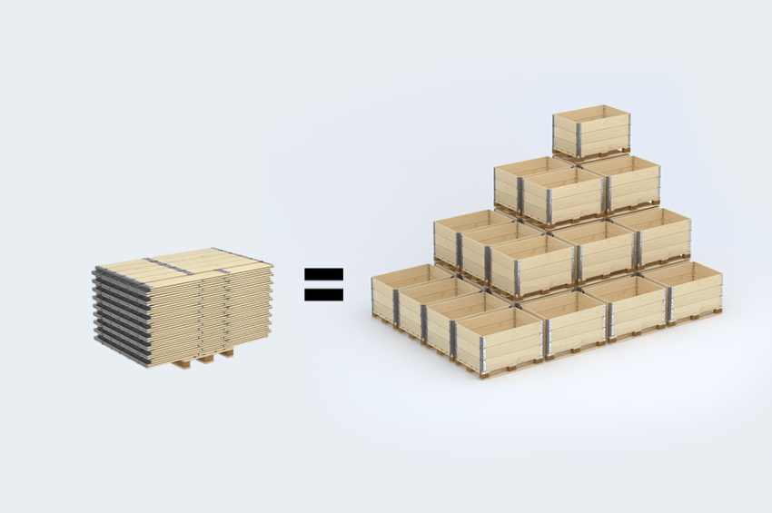 Folded pallet collars are one of the most compact wooden packaging solutions available. When folded, they save up to 87% of space, making storage and return transport far more efficient.
