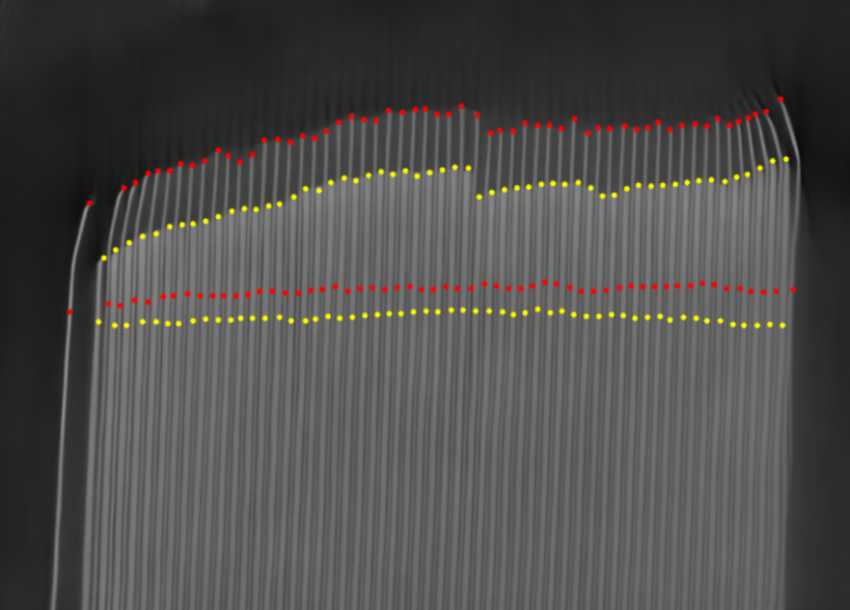 The reason electrodes cannot be adequately measured with 2D inspection lies in the sub‑200‑micron overhang range and the inherent limitations of a single projection. A 2D view can only capture the apparent electrode length at the very corner peak, but fails to reveal damage or incorrect length parameters along the electrode sheet edges, for example when a sheet is shifted or twisted.